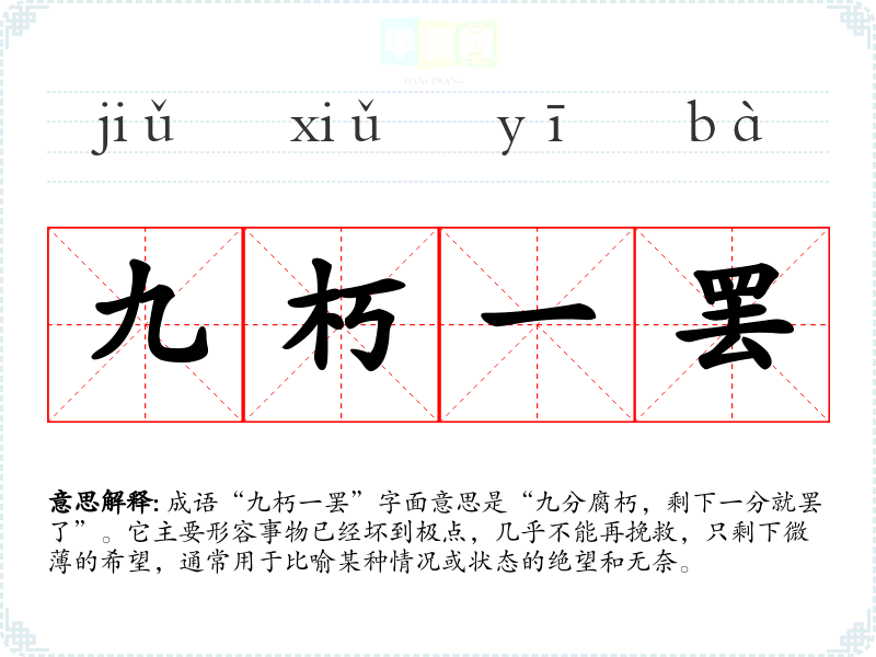 - 文学作品:在描写人物面临重大困境时,可以用“九朽一罢”来形容其绝望的心态。