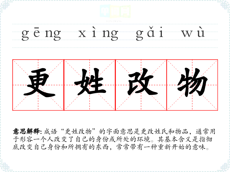 成语“更姓改物”的字面意思是更改姓氏和物品,通常用于形容一个人改变了自己的身份或所处的环境。其基本含义是指彻底改变自己身份和所拥有的东西,常常带有一种重新开始的意味。