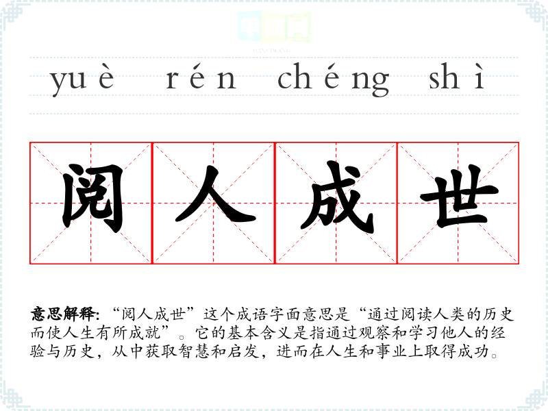 “阅人成世”这个成语字面意思是“通过阅读人类的历史而使人生有所成就”。它的基本含义是指通过观察和学*他人的经验与历史,从中获取智慧和启发,进而在人生和事业上取得成功。