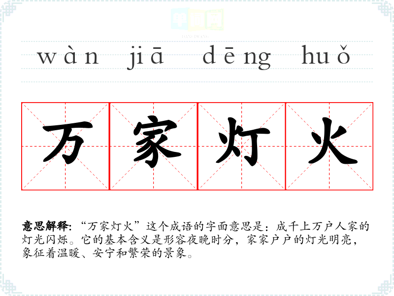 “万家灯火”这个成语的字面意思是:成千上万户人家的灯光闪烁。它的基本含义是形容夜晚时分,家家户户的灯光明亮,象征着温暖、安宁和繁荣的景象。