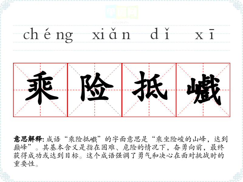 成语“乘险抵巇”的字面意思是“乘坐险峻的山峰,达到巅峰”。其基本含义是指在困难、危险的情况下,奋勇向前,最终获得成功或达到目标。这个成语强调了勇气和决心在面对挑战时的重要性。