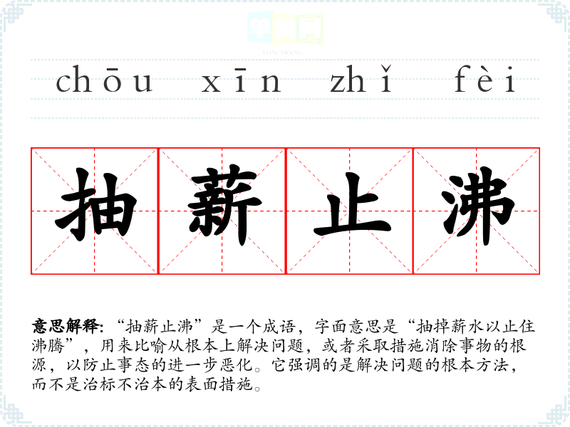| 抽薪止沸 | 薪:柴草;沸:沸腾。抽掉锅底下的柴火,使锅里的水不再翻滚。比喻从根本上解决问题。 |