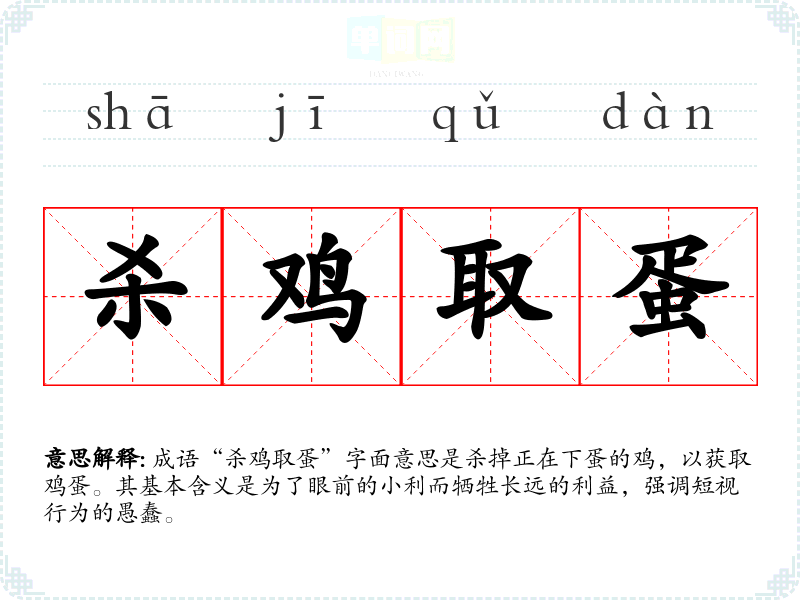 成语“杀鸡取蛋”字面意思是杀掉正在下蛋的鸡,以获取鸡蛋。其基本含义是为了眼前的小利而牺牲长远的利益,强调短视行为的愚蠢。