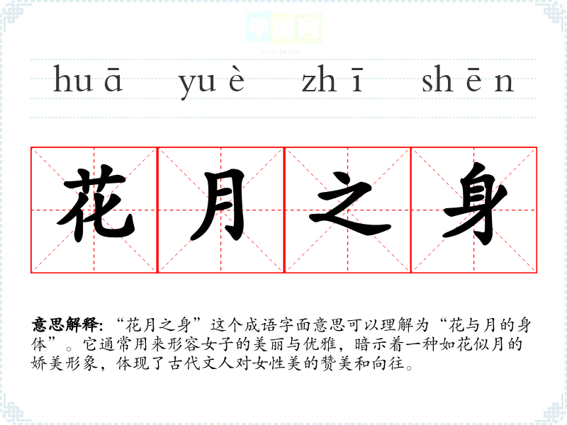 “花月之身”并不是一个非常常见的成语,可能与古代诗词中的描写有关。在古典文学中,花和月常常象征着美丽与浪漫。因此,这个成语可能源于古代的诗词,尤其是描绘女性之美的作品。例如,唐诗中常有以花月比喻女子美貌的句子。