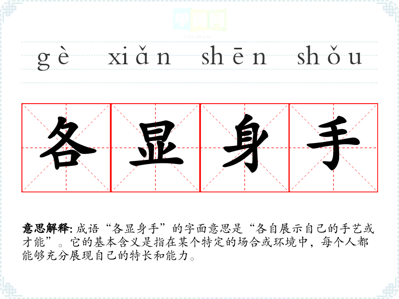 成语“各显身手”的字面意思是“各自展示自己的手艺或才能”。它的基本含义是指在某个特定的场合或环境中,每个人都能够充分展现自己的特长和能力。