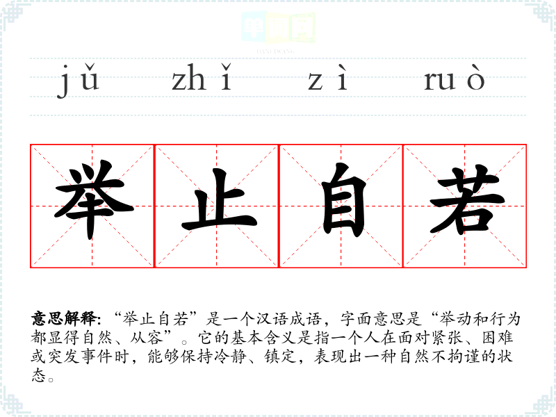 “举止自若”是一个汉语成语,字面意思是“举动和行为都显得自然、从容”。它的基本含义是指一个人在面对紧张、困难或突发**时,能够保持冷静、镇定,表现出一种自然不拘谨的状态。
