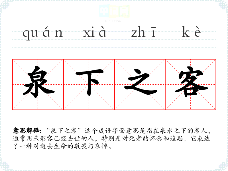 “泉下之客”这个成语字面意思是指在泉水之下的客人,通常用来形容已经去世的人,特别是对死者的怀念和追思。它表达了一种对逝去生命的敬畏与哀悼。