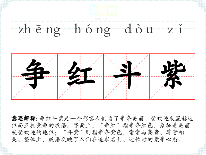 争红斗紫是一个形容人们为了争夺美丽、受欢迎或显赫地位而互相竞争的成语。字面上,“争红”指争夺红色,象征着美丽或受欢迎的地位;“斗紫”则指争夺紫色,常常与高贵、尊贵相关。整体上,成语反映了人们在追求名利、地位时的竞争心态。