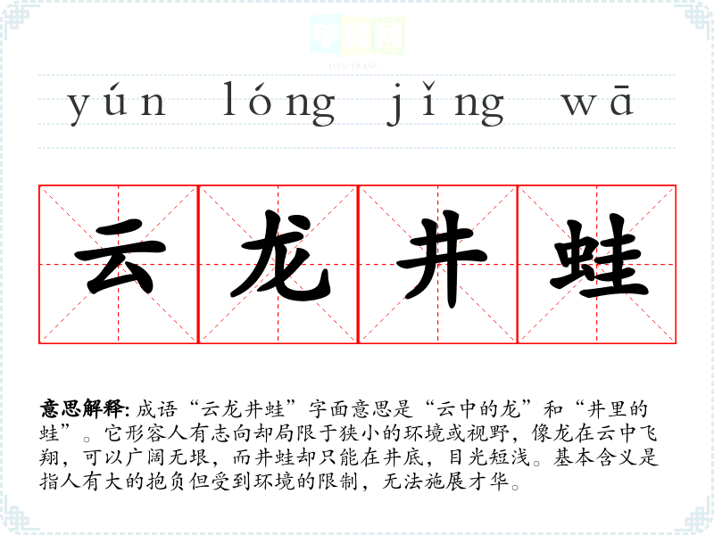 成语“云龙井蛙”字面意思是“云中的龙”和“井里的蛙”。它形容人有志向却局限于狭小的环境或视野,像龙在云中飞翔,可以广阔无垠,而井蛙却只能在井底,目光短浅。基本含义是指人有大的抱负但受到环境的限制,无法施展才华。