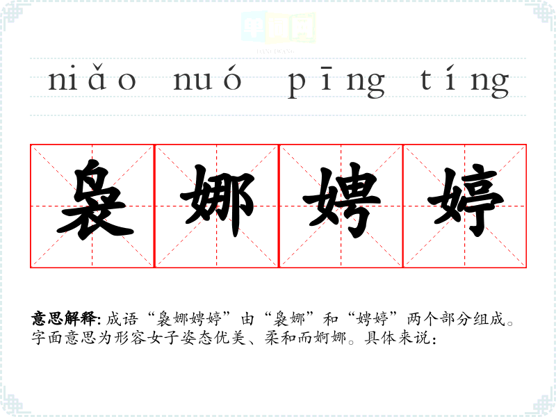成语“袅娜娉婷”由“袅娜”和“娉婷”两个部分组成。字面意思为形容女子姿态优美、柔和而婀娜。具体来说: