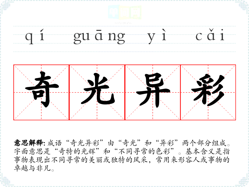 成语“奇光异彩”由“奇光”和“异彩”两个部分组成。字面意思是“奇特的光辉”和“不同寻常的色彩”。基本含义是指事物表现出不同寻常的美丽或独特的风采,常用来形容人或事物的卓越与非凡。