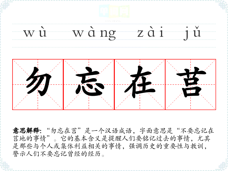 “勿忘在莒”是一个汉语成语,字面意思是“不要忘记在莒地的事情”。它的基本含义是提醒人们要铭记过去的事情,尤其是那些与个人或集体利益相关的事情,强调历史的重要性与教训,警示人们不要忘记曾经的经历。
