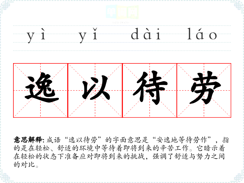 成语“逸以待劳”的字面意思是“安逸地等待劳作”,指的是在轻松、舒适的环境中等待着即将到来的辛苦工作。它暗示着在轻松的状态下准备应对即将到来的挑战,强调了舒适与努力之间的对比。