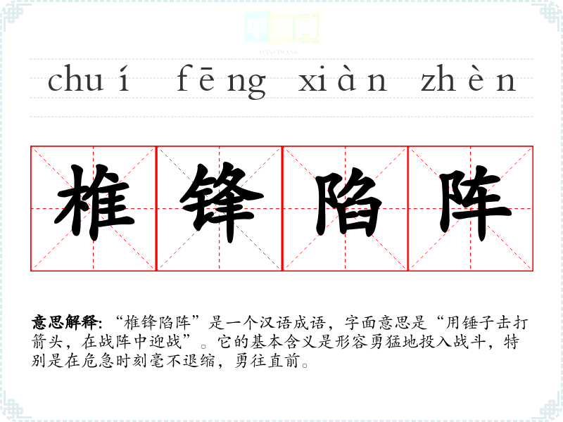 “椎锋陷阵”是一个汉语成语,字面意思是“用锤子击打箭头,在战阵中迎战”。它的基本含义是形容勇猛地投入战斗,特别是在危急时刻毫不退缩,勇往直前。