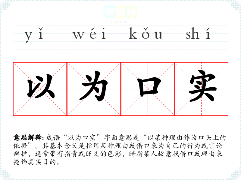 成语“以为口实”字面意思是“以某种理由作为口头上的依据”。其基本含义是指用某种理由或借口来为自己的行为或言论辩护,通常带有指责或贬义的色彩,暗指某人故意找借口或理由来掩饰真实目的。