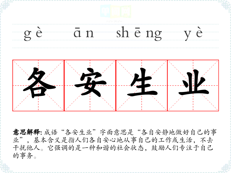 “各安生业”让我联想到一种宁静和专注的状态。在快节奏的现代生活中,能够专注于自己的事情,不被外界打扰,是一种难得的幸福。这种成语也提醒我在日常生活中,要尊重他人的选择与工作。